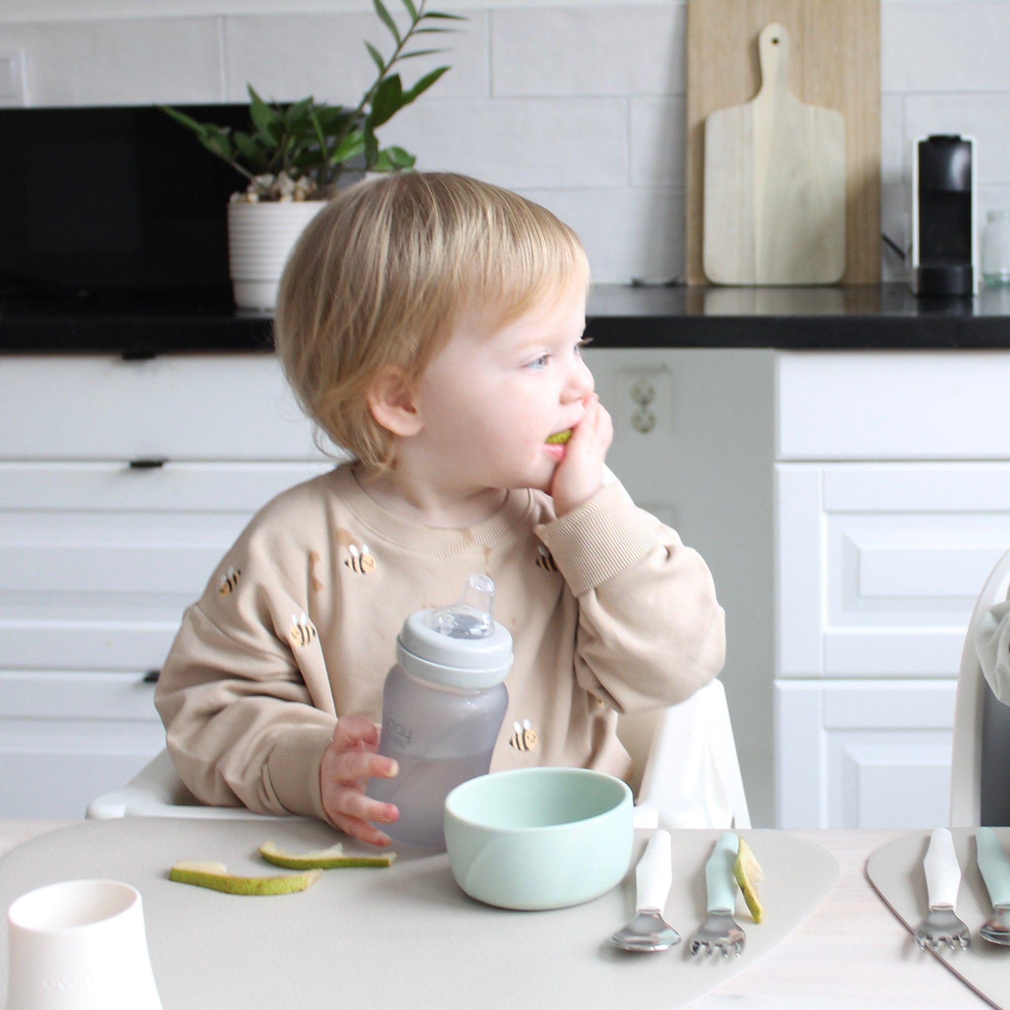 Den djupa formen och de höga kanterna hjälper till att hålla maten kvar i skålen och gör det lättare för barnet att skopa upp maten när de lär sig äta självständigt.